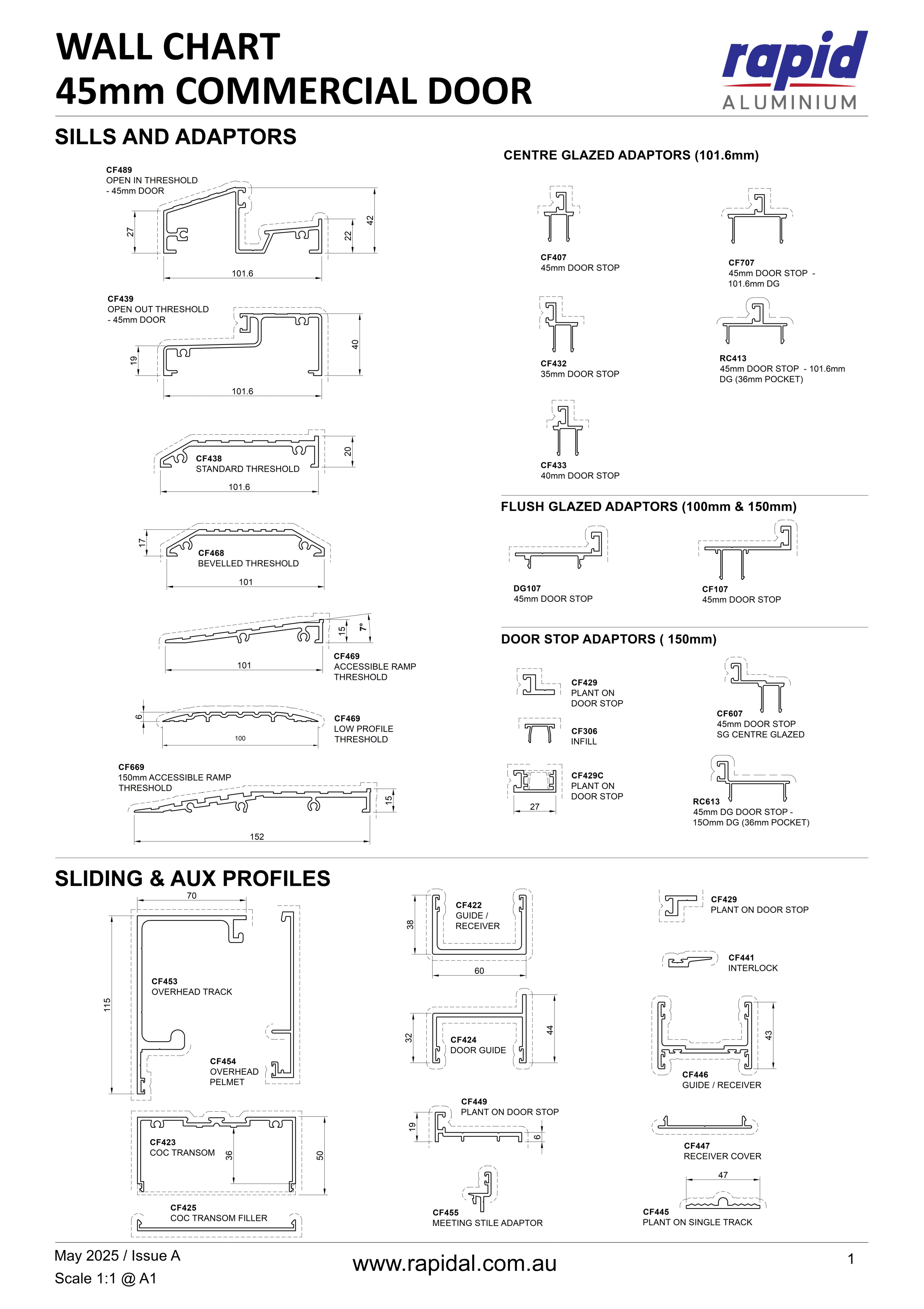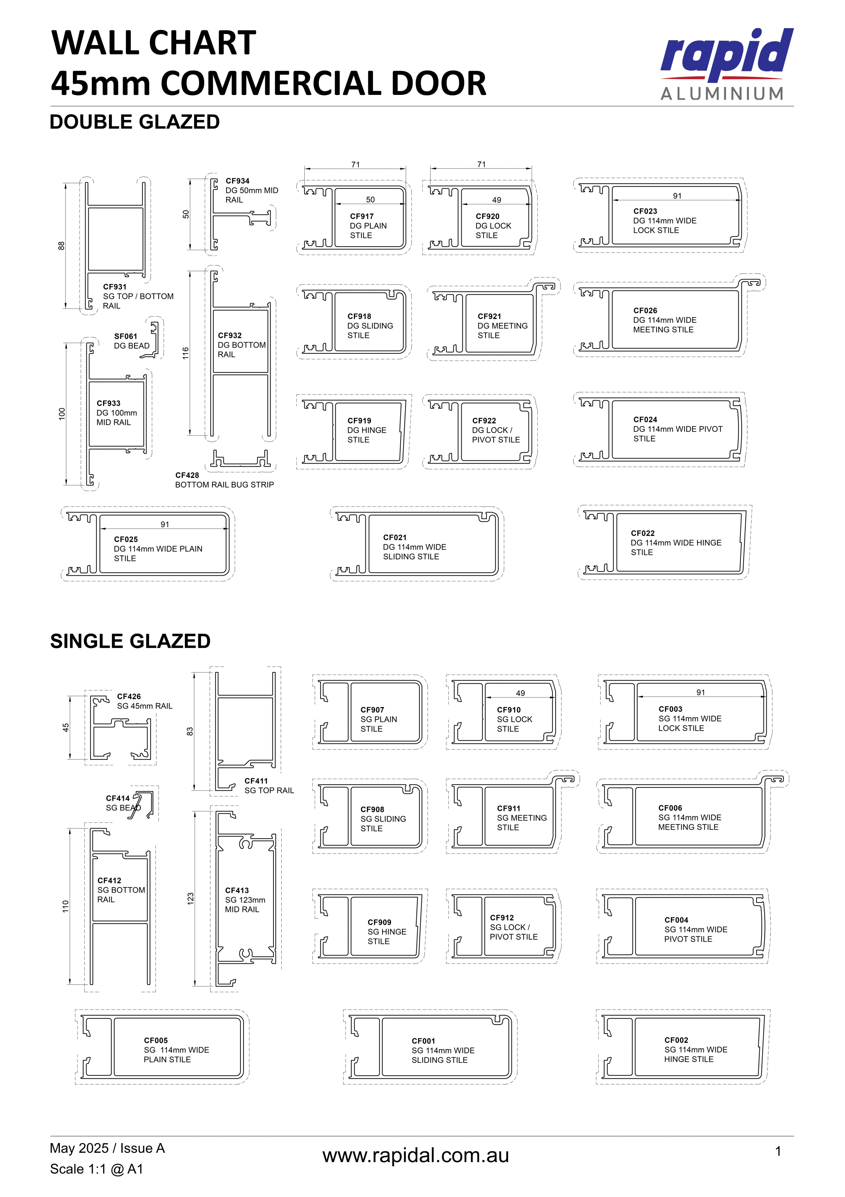 The 45mm Commercial Door is a highly adaptable shopfront solution designed for ease of fabrication and installation. Suitable for a variety of applications, it supports hinged, pivoted, and sliding configurations. This door integrates seamlessly with Rapid commercial framing systems through purpose-built adaptors. It has been tested to AS2047 standards for both internal and external opening setups, ensuring reliable performance across and compliance.
